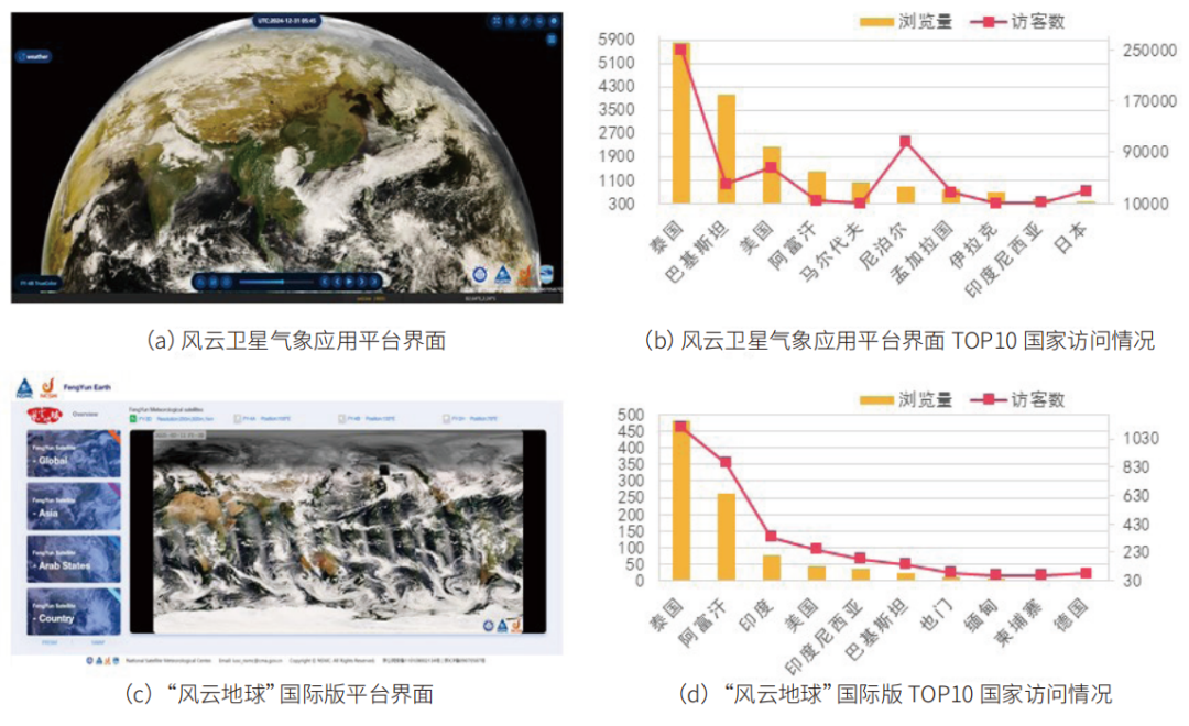 「风云地球」国际版根据不同国际用户的个性化需求,打造了涵盖全球版、区域版、国家版、专业版、专项服务版的「风云地球」国际版谱系,提供包括卫星云图、气象要素、灾害事件、气候监测等在内的5大类100多个定量化、多尺度产品,为国际用户提供「高时效、智能化、精细化、可定制」的风云气象卫星遥感应用服务。该平台支持不同业务场景,根据不同国家和区域,配置重点关注的气象要素、观测区域、时间范围等,以满足用户使用的便捷性和实用性。该平台(fyearth.nsmc.org.cn/)自2023年11月正式发布以来,截至2024年12月,来自70个国家3745个用户访问「风云地球」平台,浏览访问量达到15120次。图9为两个全球公共数据应用平台的首页图及国家访问情况。