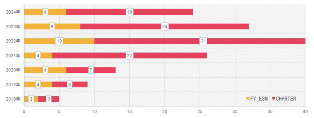 FY_ESM注册用户国家从2018年的14个增加到2024年的36个,自2018年9月首测启动FY_ESM起,截至2024年12月,响应国际应急服务请求40次。CHARTER应急响应国家数从2018年的4个增加到2024年的54个(仅2021年就为全球22次重大灾害提供近6000景2T的数据),截至2024年12月,响应国际应急服务请求155次(图8)。表2为2018—2024年应急数据服务灾害类型占比。