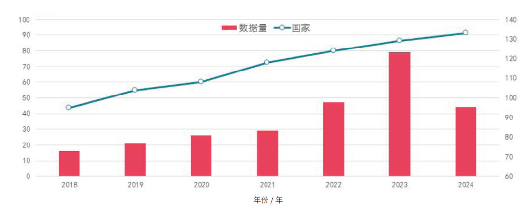 风云系列气象卫星是中国自主研发的主要用于天气气候预测和防灾减灾的对地观测卫星。目前,中国已成功发射21颗风云气象卫星,实现8颗卫星同时在轨运行的业务运行模式,风云气象卫星数据共享在国外已经得到广泛应用。截至2024年,风云气象卫星为全球133个国家和地区(不含中国)提供对地观测资料和产品(图1),共产生近2万次国际数据服务单,总数据量近400TB,气象卫星的数据和产品被广泛应用于气象、海洋、农业、林业、国土、水利、环保、交通和航空航天等多个行业和领域,产生了良好的社会效益和经济效益。