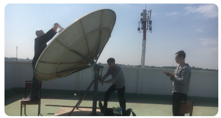 中国气象局建有气象数据CMACast,作为地球观测组织(GEO)的全球卫星数据广播分发体系的3个核心成员之一,该系统可为国际用户提供包括风云气象卫星资料在内的气象数据接收、处理、显示、应用等一站式气象数据服务。国际用户主要采用CMACast系统接收风云卫星数据,日均广播数据量达到300GB,目前已经涵盖老挝、巴基斯坦、哈萨克斯坦、巴布亚新几内亚、斯里兰卡等12个国家气象部门,并且在这些国家预报预测业务中发挥了较大的作用。近几年,针对防灾能力较弱、经济较为落后的国家,中国气象局开展多次CMACast海外接收系统的设备和软件升级,并派遣专家团队前往部分国家开展现场技术调研、培训和维保,图6为专家团队调整卫星接收天线角度,恢复老挝气象与水文局卫星广播数据接收。
